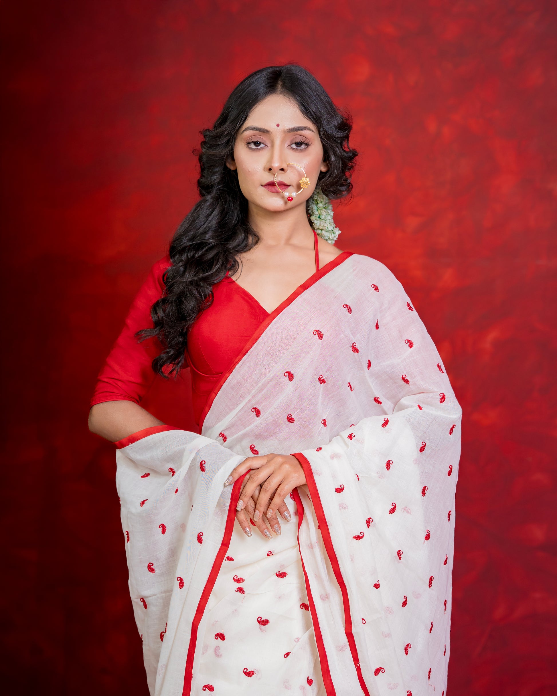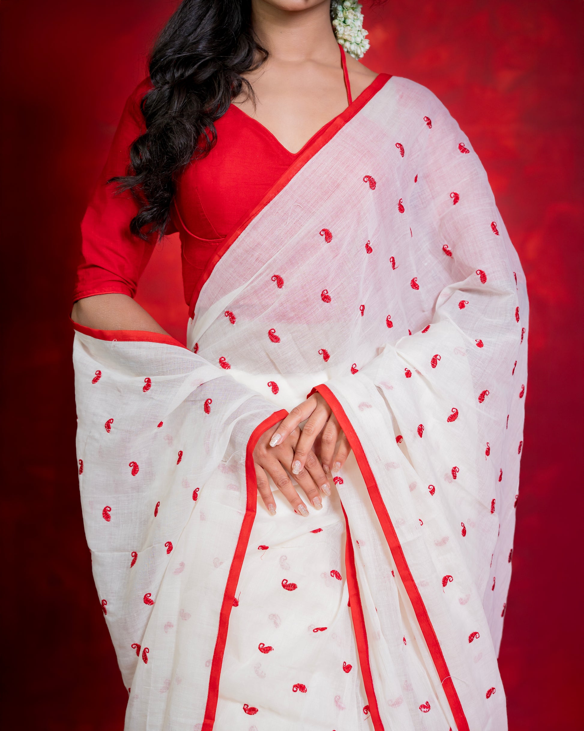 Embrace timeless elegance with the Handwoven Cotton Saree, a piece that beautifully balances heritage with contemporary charm. Woven in pristine white and adorned with delicate red 'kolka' motifs, this saree is a celebration of Indian craftsmanship and grace. The striking red border frames the drape, adding vibrance and sophistication, making it perfect for both festive occasions and refined everyday wear.