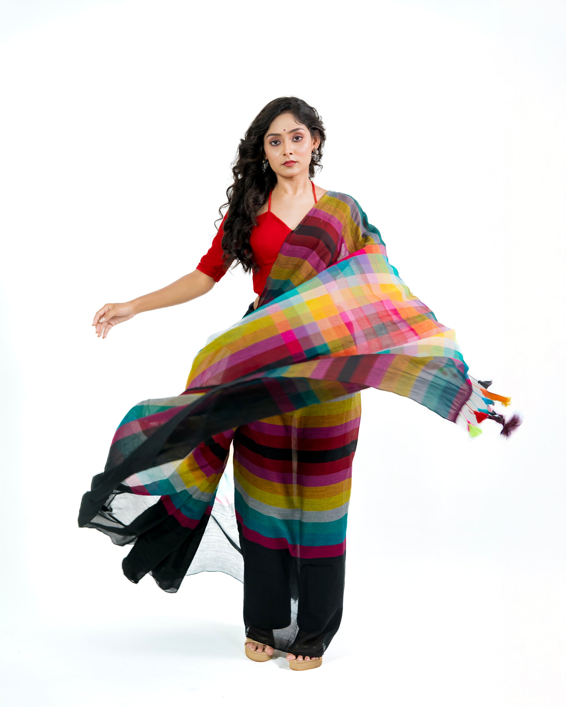 Add a splash of happiness and heritage to your collection with the Rainbow Stripe Mul Cotton Saree—an effortless way to stand out in color, comfort, and elegance.
