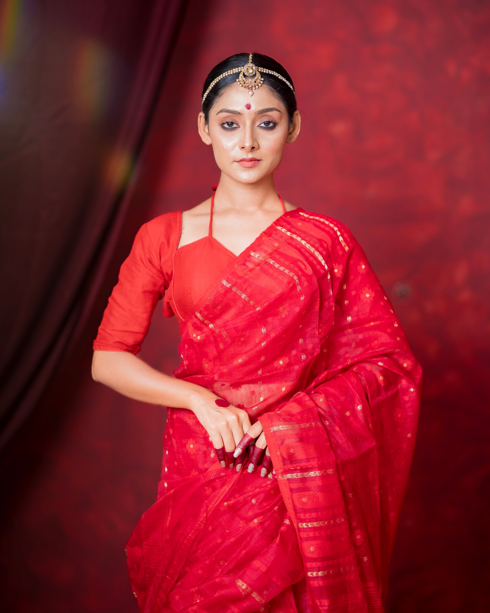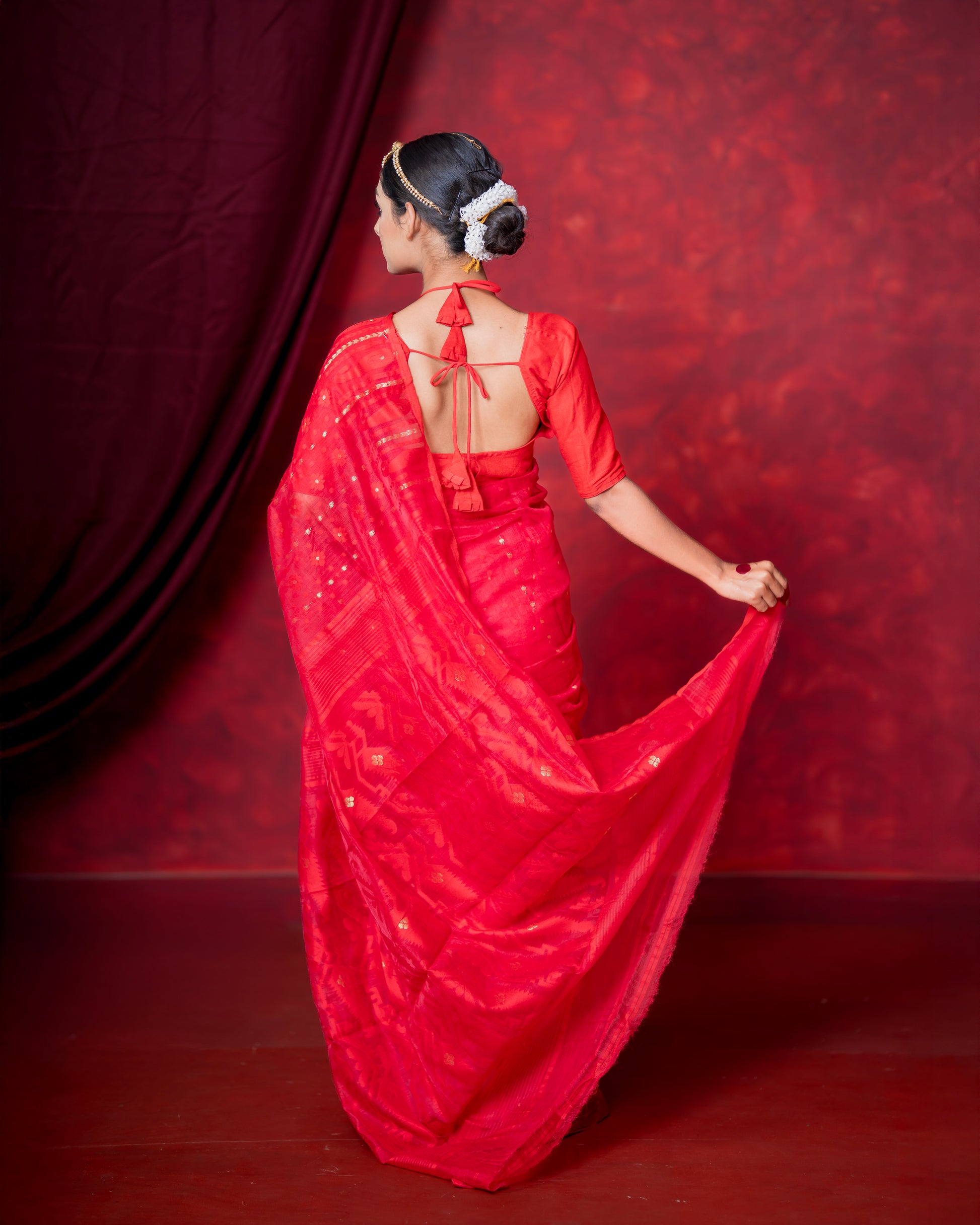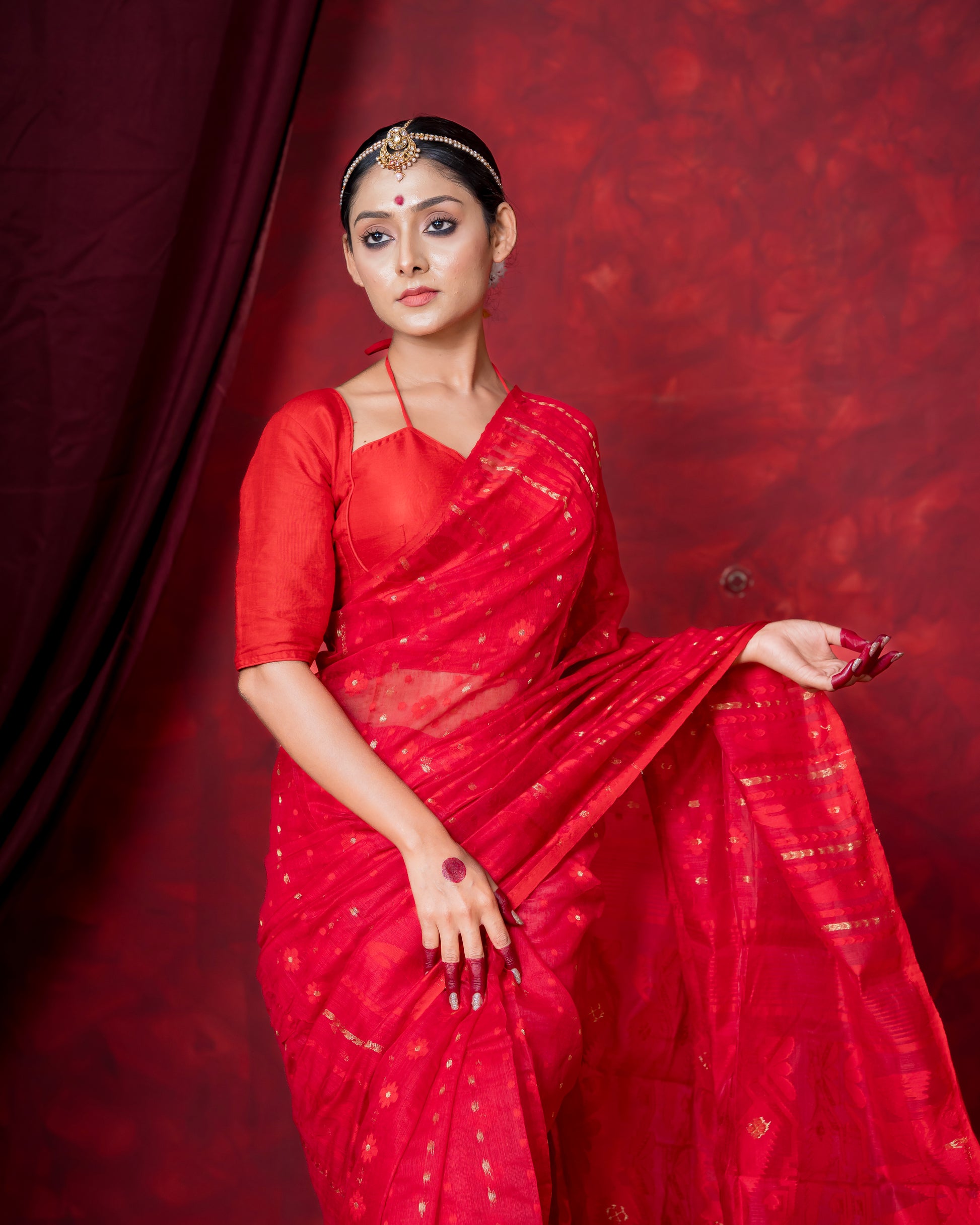 Woven in a striking scarlet red, the saree features delicate Jamdani motifs that shimmer subtly across the body, creating a perfect balance between festive elegance and timeless heritage.